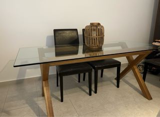 Mesa Jantar Vidro e Pés Cavalete Madeira