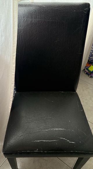 Conjunto de seis cadeiras de jantar com estrutura robusta. - Assento e encosto em material sintético. - Design moderno e elegante. - A precisar de reparação ou uso de capas.