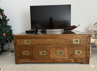 Mesa de centro com um design colonial, feita em madeira maciça com detalhes em metal e tampo em vidro. - Acabamento em madeira com veios aparentes. - Puxadores em metal dourado. - Estrutura robusta e elegante.