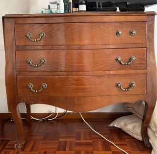 Conjunto Quarto Cerejeira Maciça (3 peças) Conjunto clássico estilo Bombe/D. Luís XV em cerejeira maciça. Design elegante com linhas curvas e ferragens em latão (puxadores removíveis). Inclui: • 1 Cómoda (3 gavetas): 110 x 51 x 104 cm • 2 Mesas de Cabeceira (2 gavetas): 53 x 40 x 71 cm Preços: • Conjunto: 275 • Individual: Cómoda (180) Par Mesas (95€) Estado: Muito bem estimado, madeira com brilho e gavetas funcionais.