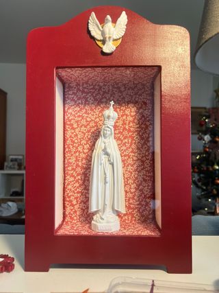 Oratório em madeira pintado de vermelho com imagem de Nossa Senhora de Fátima. - Detalhe do Espírito Santo no topo - Interior forrado com tecido de parede floral com cordão de seda - pode ser enviado sem imagem - frente em vidro