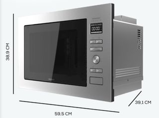 Microondas Cecotec de encastre, con un diseño moderno en acero inoxidable. - Medidas: 59,5 cm (ancho) x 38,9 cm (alto) x 39,1 cm (fondo). - Panel de control digital con pantalla. - Acabado en acero inoxidable.