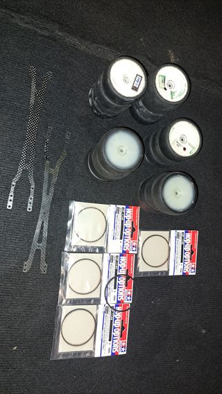 Material para carro telecomandado 2 barras de estabilização em carbono novas a estrear. carbono 4 jogos de rodas. As rodas que estão manchadas é pó. São rodas usadas mas com bastante piso ainda. Correias completamente novas. Mesmo a que não está embalada, está nova a estrear.