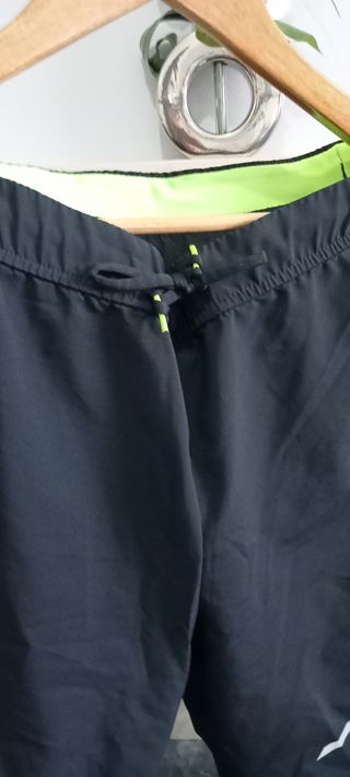 Calções desportivos pretos da marca Kalenji. Calções Usados de cor Preta da marca Kalenji, tamanho L. - Cintura elástica. - Detalhe refletor na perna direita. - Forro interior em verde limão.
