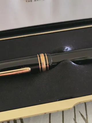 Vendo caneta de tinta permanente Montblanc, modelo Meisterstück 146 (LeGrand). Fabricada na antiga Alemanha Ocidental (W. Germany) nos finais dos anos 80. Cor: preto com clip e anel banhados a ouro. Aparo: Ouro Maciço 14k Monocromático característico desta época. Tamanho F. Estado: muito bom, sem marcas de uso. Mantém o autocolante original e inclui estojo original Montblanc. Envio rápido e protegido. #montblanc #146 #legrand #wgermany #vintage #monotone #goldnib #fountainpen #pluma