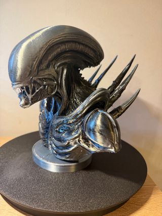 Alien Xenomorph bust, 3D printed and hand-painted, finished with an acrylic varnish for increased durability and an organic-looking effect. The paintwork was done manually, with close attention to biomechanical details, shadow contrast, and the creature’s signature glossy finish. An ideal piece for movie fans, sci-fi enthusiasts, and collectors. 🔹 Material: PLA 🔹 Finish: Hand-painted + acrylic spray 🔹 Condition: Very good ℹ️ Note: There is a small defect on the rear of the bust, barely visible when displayed from the front. It does not affect the overall appearance or the stability of the piece (visible in the photos).