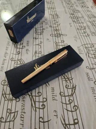 Vendo caneta de tinta permanente Waterman, modelo Maestro. Uma versão Premium e requintada deste clássico modelo francês, com acabamento totalmente dourado. Acabamento: Corpo e tampa Banhados a Ouro Aparo: Aço. Tamanho F (Fino). Estado: muito bom, sem marcas de uso. Com caixa original Waterman. Envio rápido e protegido. #waterman #maestro #vintage #goldplated #fountainpen #tinta_permanente #caneta #colecao #escrita #caneta #pluma