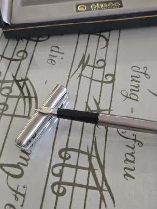 Vendo caneta de tinta permanente da extinta marca alemã Elysée. Modelo Dynamic (Linha 60), conhecido pelo seu design minimalista e construção robusta alemã. Acabamento: Brushed Steel (Aço Escovado/Mate) Aparo: Aço Inoxidável, tamanho M (Médio). Estado: como nova sem marcas de uso. Inclui caixa original e o conversor original da Elysée. Envio rápido e protegido. #elysee #elyseepen #vintage #germany #fountainpen #brushedsteel #escrita #caneta #pluma