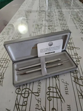 Vendo conjunto de escrita vintage da marca espanhola Inoxcrom. Um set clássico dos anos 80/90. Modelo: Inoxcrom 77 Slim (Estilo Flighter). Material: Aço Escovado (Brushed Stainless Steel). O Conjunto Inclui: Caneta de Tinta Permanente. Esferográfica: Mecanismo de clique, corpo em aço. (Nota: a carga original pode necessitar de substituição devido aos anos - usa recargas padrão tipo Parker). Estado: muito bom, com caixa original Inoxcrom. Envio rápido e protegido. #inoxcrom #vintage #madeinspain #fountainpen #caneta #esferografica #set #aco #brushedsteel #pluma #boligrafo