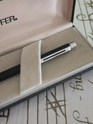 Vendo caneta de tinta permanente Sheaffer, modelo Targa Slim (versão fina). Modelo: Targa Slim Model 1002. Acabamento: Preto Mate (Matte Black) com clipe e anéis Cromados. Aparo: Aço Inoxidável, estilo Inlaid (embutido), exclusivo da Sheaffer. Inclui o Conversor Slim Original. (Nota: Estes conversores são obsoletos e difíceis de encontrar). Estado: muito bom, sem marcas de uso. Inclui caixa original Sheaffer. Envio rápido e protegido. #sheaffer #targa #targaslim #matteblack #vintage #fountainpen #converter #rare #escrita #caneta #pluma