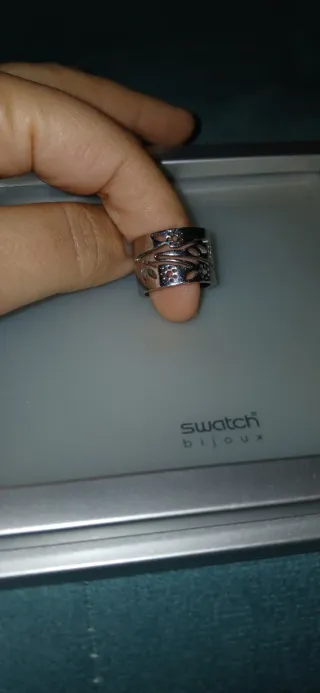 Anel da Swatch Bijoux com um design elegante. - Tamanho 7 (aproximadamente 17.3 mm de diâmetro). - Acabamento prateado com detalhes vazados. - Padrão floral e de folhas.