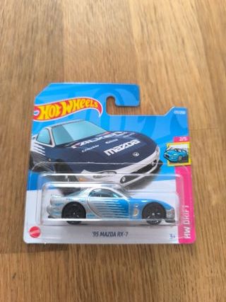 Miniatura do icónico Mazda RX-7 de 1995, parte da coleção HW Drift. - Escala 1:64. - Design inspirado em carros de drift. - Detalhes em azul e prata.