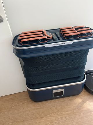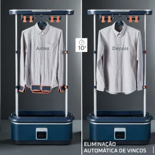 Ferro de engomar Rowenta Care for you first. Design moderno e elegante. - Sistema automático para engomar e higienizar com um processo autónomo para eliminar vincos e higienizar; - Eliminação automática de vincos com alisadores de 10 a 30 minutos, consoante as suas necessidades; - Dá para inserir facilmente até 3 peças de roupa; - Inclui: comando remoto, 3 cabides rotativos, 4 alisadores grandes 8 alisadores pequenos, um depósito de água amovível com 1.2 L de capacidade e fácil de encher. - Ainda tem garantia de 3 anos. Tem apenas 3 meses. Cores: azul, rosa metálico.