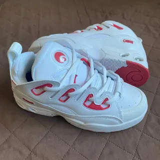 Ténis Osiris D3 E em branco com detalhes em vermelho. Um clássico para quem gosta de estilo. - Design icónico. - Combinação de cores vibrante.