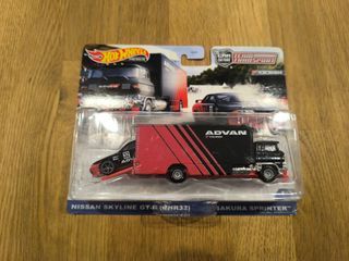 Coleção Hot Wheels Team Transport com o tema Advan. - Inclui um camião e um carro. - Modelo: Nissan Skyline GT-R (R32) Sakura Sprinter.