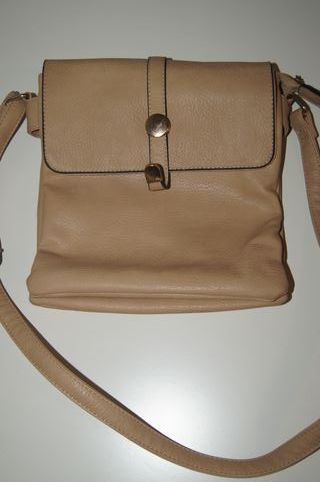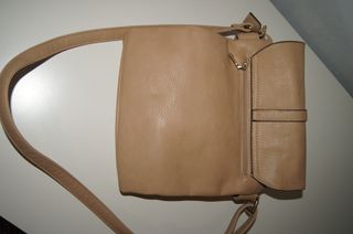 Carteira feminina em tom bege, com fecho de botão. - Material com textura. - Alça de ombro ajustável. - Detalhes em metal dourado.