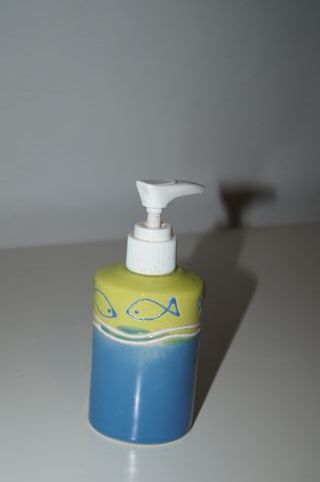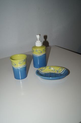 Conjunto de casa de banho em cerâmica com um design divertido de peixes. - Peça com dispensador de sabão. - Copo. - Saboneteira.