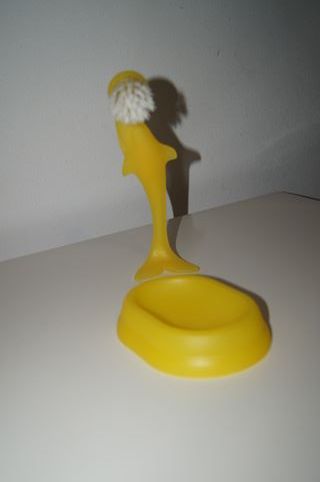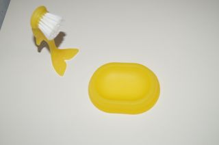 Conjunto de saboneteira e escova com design divertido de golfinho. - Cor amarela vibrante. - Feito de plástico durável.