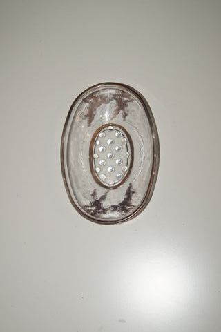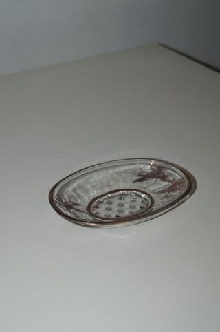 Saboneteira em vidro com detalhes em dourado. - Design oval. - Centro com relevos circulares. - Bordas com acabamento em dourado.