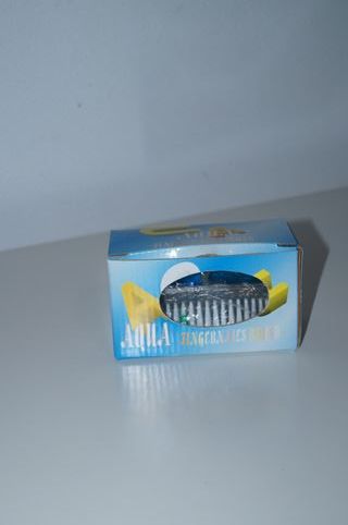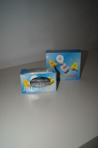 Conjunto de saboneteira e escova de unhas. - Design moderno com letras AQUA. - Cores vibrantes em azul e amarelo.