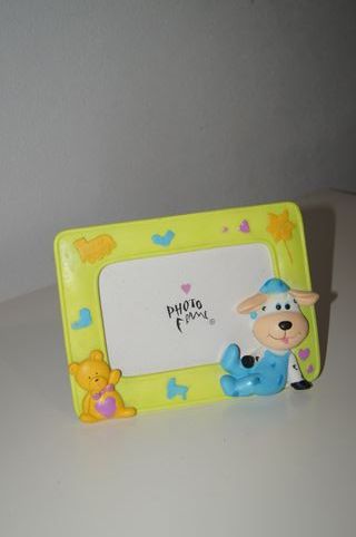 Porta-retrato em tom verde limão com decorações infantis. - Detalhes em relevo de ursinho, vaquinha e outros elementos. - Moldura com acabamento arredondado. - Espaço para foto central.