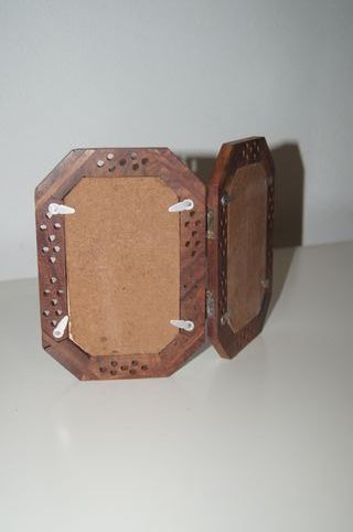 Porta-retratos duplo com um design octogonal e detalhes entalhados. - Estrutura em madeira. - Detalhes em metal dourado. - Abertura articulada.