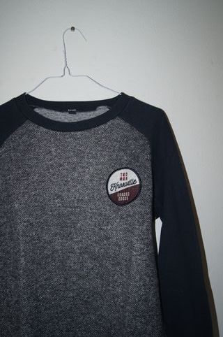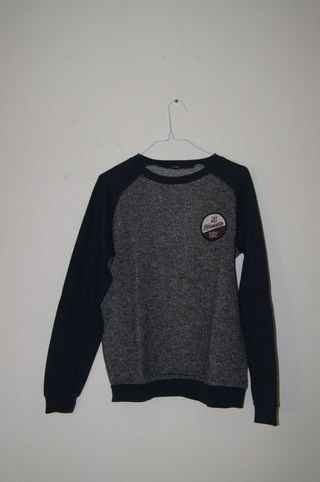 Camisola de manga comprida com um design moderno. - Cor principal cinza mesclado com mangas pretas. - Patch redondo com detalhes em relevo no peito.