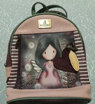 Mochila com um design encantador da Santoro. - Estampa com personagem. - Detalhes em roxo e rosa. - Alças ajustáveis.