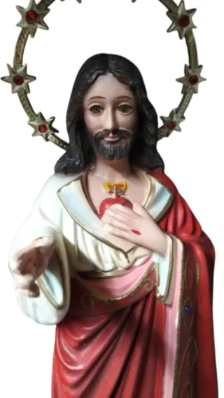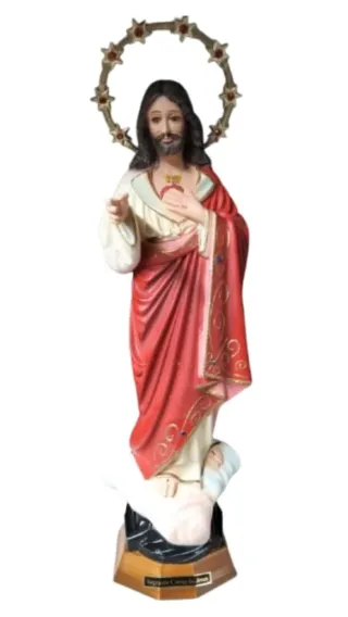 Imagem do Sagrado Coração de Jesus com 36 cm de altura. - Detalhes em dourado e pedras vermelhas na auréola. - Coração vermelho com detalhes dourados no peito. - Manto vermelho com detalhes dourados e azuis.