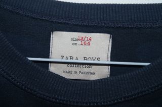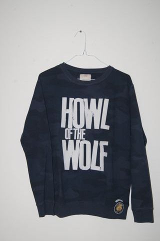 Camisola da Zara Kids em tamanho 13-14 anos, com uma estampa gráfica Howl of the Wolf em branco. - Padrão camuflado subtil no tecido. - Gola redonda. - Manga comprida. - Detalhe de emblema circular na parte inferior.