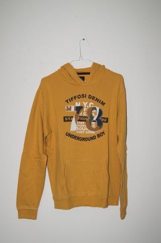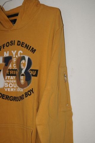 Camisola Tiffosi Denim com estampa Underground Boy e número 78. - Cor amarela. - Tamanho 13-14 anos. - Capuz. - Bolso frontal.