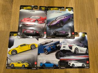Conjunto de 5 miniaturas da coleção Hot Wheels Timeless Icons. - Ferrari F50 - Koenigsegg Agera R - Porsche Carrera GT - Nissan Skyline GT-R (R34) V-Spec II - Lexus LFA
