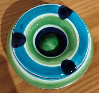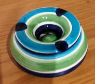 Cinzeiro em cerâmica com um design vibrante e colorido. - Padrão de listras em tons de azul e verde. - Detalhes em azul escuro. - Recipiente para água integrado.