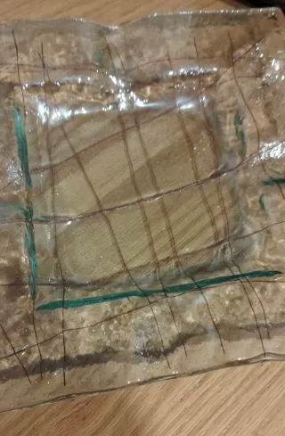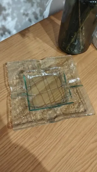 Peça em vidro com um design moderno e elegante, ideal para colocar chaves ou como cinzeiro. - Material: Vidro - Design com linhas em tons de castanho e verde - Formato retangular