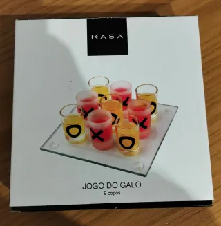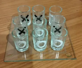 Jogo do galo divertido com copos de shot em vidro. - 9 copos incluídos. - Design temático de jogo do galo. - Copos em vidro com marcações. - Base em vidro para o jogo.