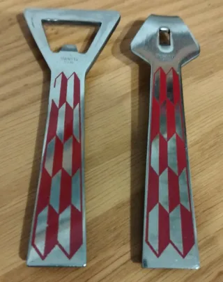 Conjunto de utensílios de cozinha em metal com detalhes em vermelho e prata. - Saca-rolhas com espiral. - Saca-caricas. - Abre-latas.