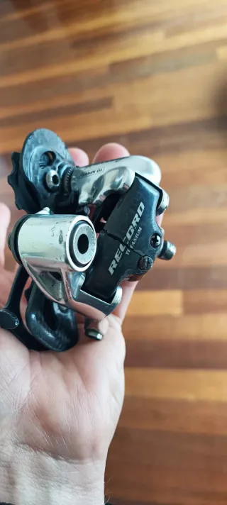 Cambio traseiro Campagnolo Record Titanium. Todo em carbono. Apenas tem a tampa partida. - Modelo de 10 velocidades. - Construção em titânio para leveza e durabilidade.