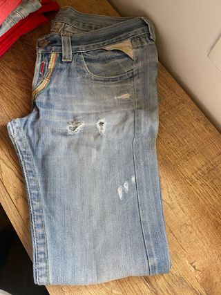 Conjunto de 12 calças em ótimo estado. - Inclui 2 calças jeans e 8 calças de sarja em tons pastel e vibrantes. - As calças jeans apresentam um visual desgastado, dando um toque estiloso. - As calças de sarja são macias e confortáveis.