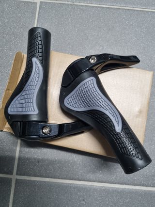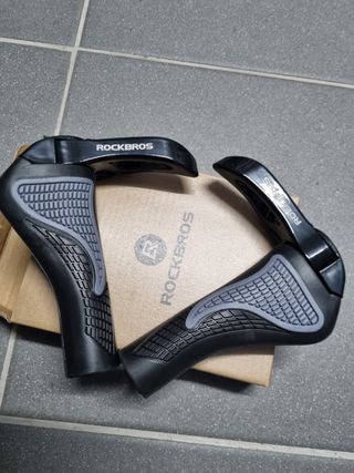 Conjunto de punhos ergonómicos para bicicleta da marca ROCKBROS. Design que proporciona conforto e melhor aderência. - Cor: Preto e cinza. - Material: Borracha e plástico.