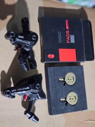 Conjunto de dois freios a disco da marca PROMAX. Peças como novas, prontas para instalação. Frente e traseiro. Com 2 pares de pstilhas - Cor: Preto - Material: Alumínio - Tipo: Mecânico