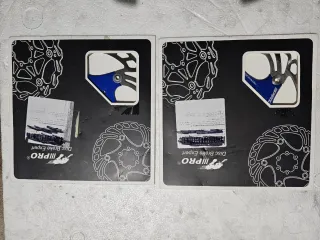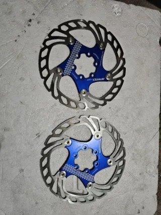 Conjunto de dois discos de travão para bicicleta, com 160mm de diâmetro. Estão praticamente novos. - Diâmetro: 160mm - Cor do cubo: Azul - Design perfurado para melhor dissipação de calor