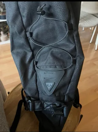 Saco de selim Topeak, ideal para bikepacking. Diseño en color negro con detalles texturizados. - Cierre con hebillas y correas ajustables. - Cordón elástico exterior para sujeción adicional. - Logo de Topeak visible.