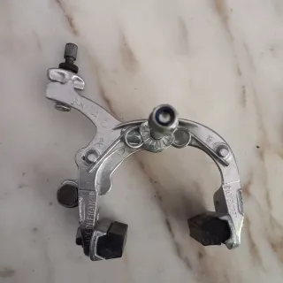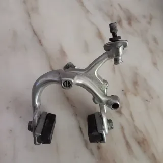 Travão de bicicleta da marca Lusito, modelo M-80. Peça de metal prateado com calços de travão. - Marca: Lusito - Modelo: M-80 - Material: Metal - Cor: Prateado - Inclui calços de travão