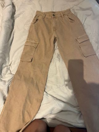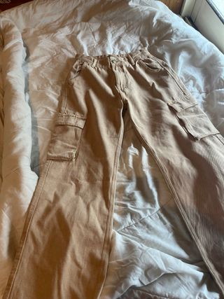 Calças cargo em tom bege, com um corte moderno e prático. - Bolsos laterais. - Cintura com passadeiras para cinto. - Fecho de correr e botão.