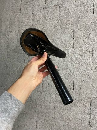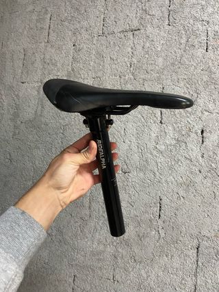 Conjunto de selim Fizik e espigão de selim Ride Alpha. - Selim preto. - Espigão de selim preto com marcações.