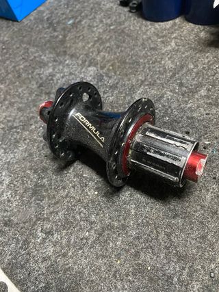 Cubo Formula para bicicleta de montanha, modelo 12x142 com 32 furos para disco de 6 furos. Apresenta-se em bom estado, com algumas marcas de uso. - Modelo: Formula 12x142 - Sistema de travagem: Disco - Número de furos: 32 - Fixação do disco: 6 furos