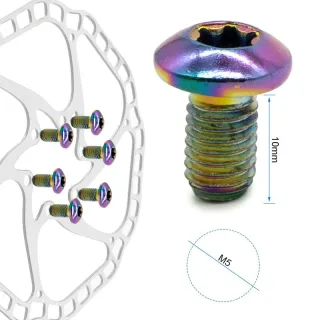 Conjunto de 12 parafusos M5x10mm com acabamento colorido. Ideais para discos de travão. - Quantidade: 12 unidades. - Tamanho: M5x10mm. - Acabamento: Colorido (efeito iridescente/titânio).
