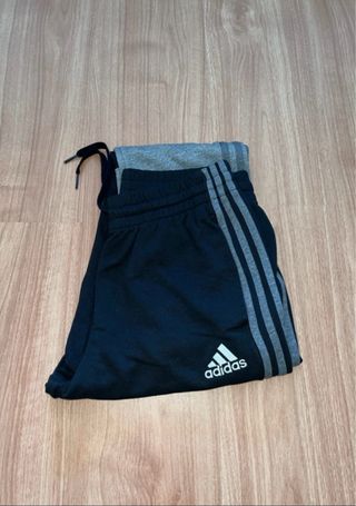Calças de fato de treino Adidas em preto e cinzento. Apresentam o logótipo da marca na frente e as icónicas três riscas nas laterais. - Cor: Preto e cinzento - Logótipo Adidas - Três riscas laterais