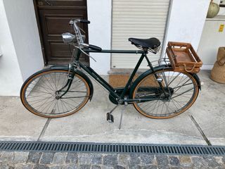 Bicicleta Raleigh vintage, com rodas de 26 polegadas e selim Brooks. Apresenta-se em bom estado, com pintura verde escura e detalhes cromados. - Modelo Raleigh de construção clássica. - Rodas aro 26. - Selim Brooks de couro. - Pneus com faixa bege.