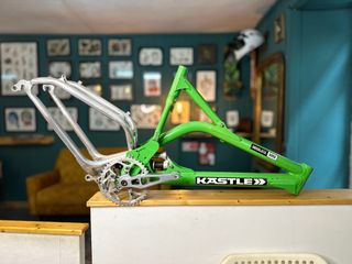 Quadro de bicicleta Kastle Absolute 9000 Design robusto e icónico. Inclui pedaleira Kastle O dropout do desviador traseira necessita reparação simples. - Quadro em alumínio. - Cor verde. - Design de suspensão traseira.